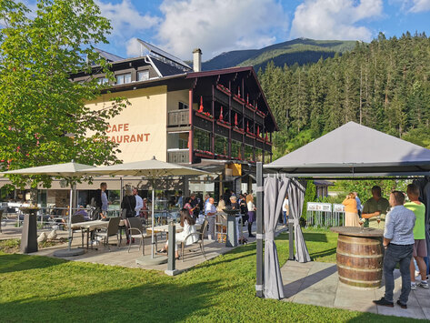 Culinary delights are a top priority in our family-run business. You have the choice between the "Genießer Wirtshaus" with modern interpretations of traditional specialities, or the creative Alpine flavour cuisine in "Gründlers Gourmet Stüberl", crowned with 4 toques and 1 Michelin star, which focuses on creations with game, merino sheep and fish from the Achensee region.